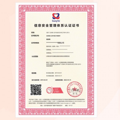 ISO27001认证是关于信息安全管理体系认证,能有效保证企业在信息安全领域的可靠性,降低企业泄密风险,更好的保存核心数据。